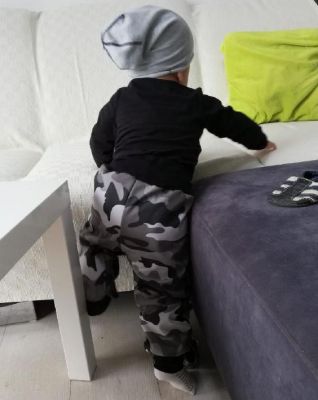 Kalhoty mají vyšší náplet v pase - ve vrchní části je gumička pro lepší fixaci pasu. Vysoký náplet v pase zabrání, aby dítěti foukalo na záda, když se třeba ohne a kalhotky se posunou.